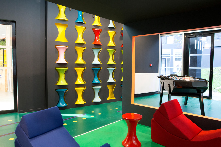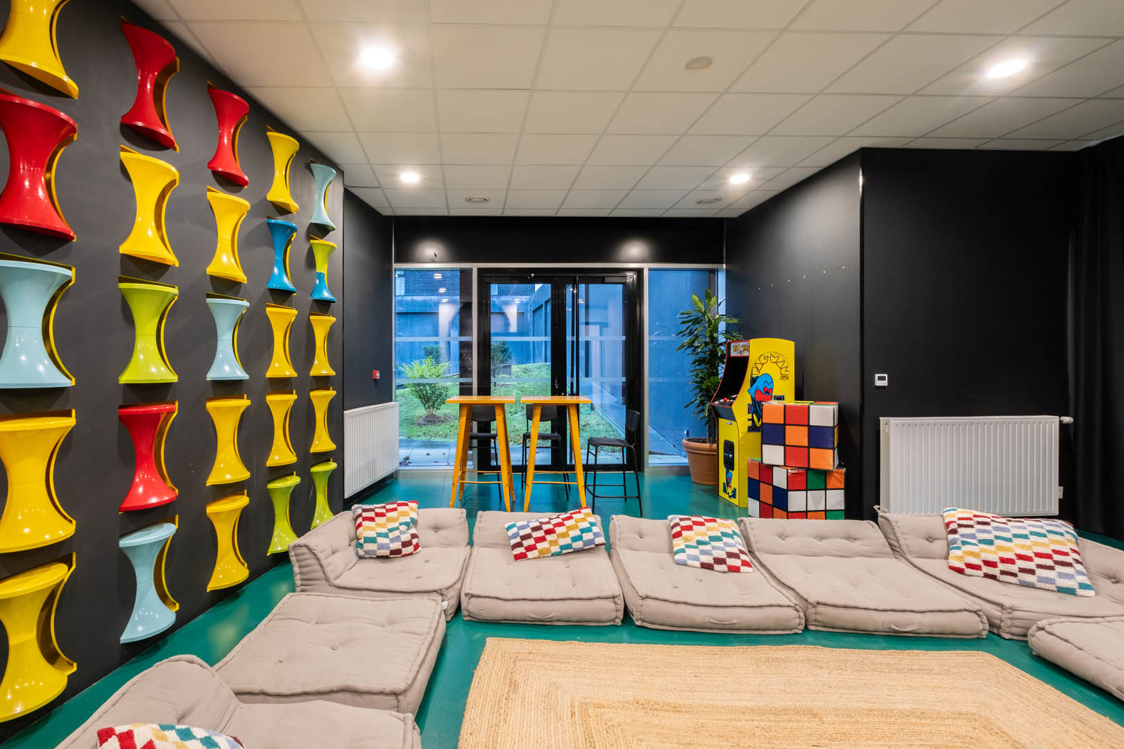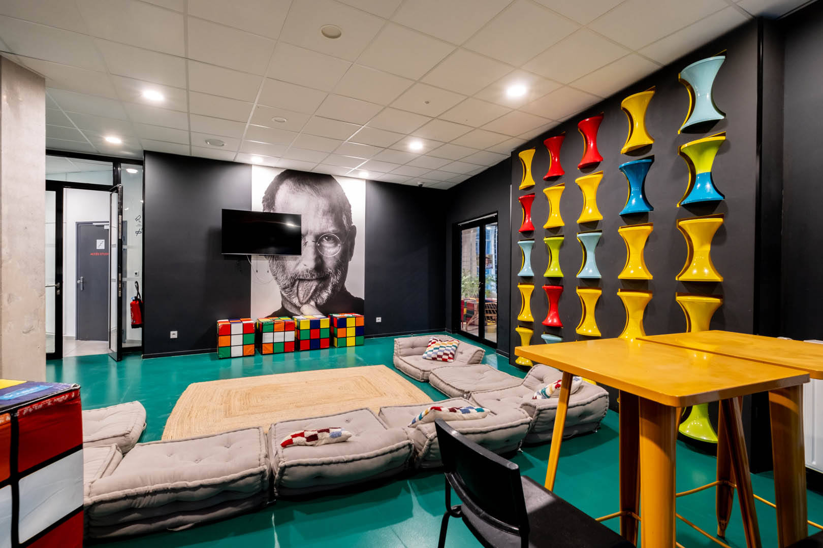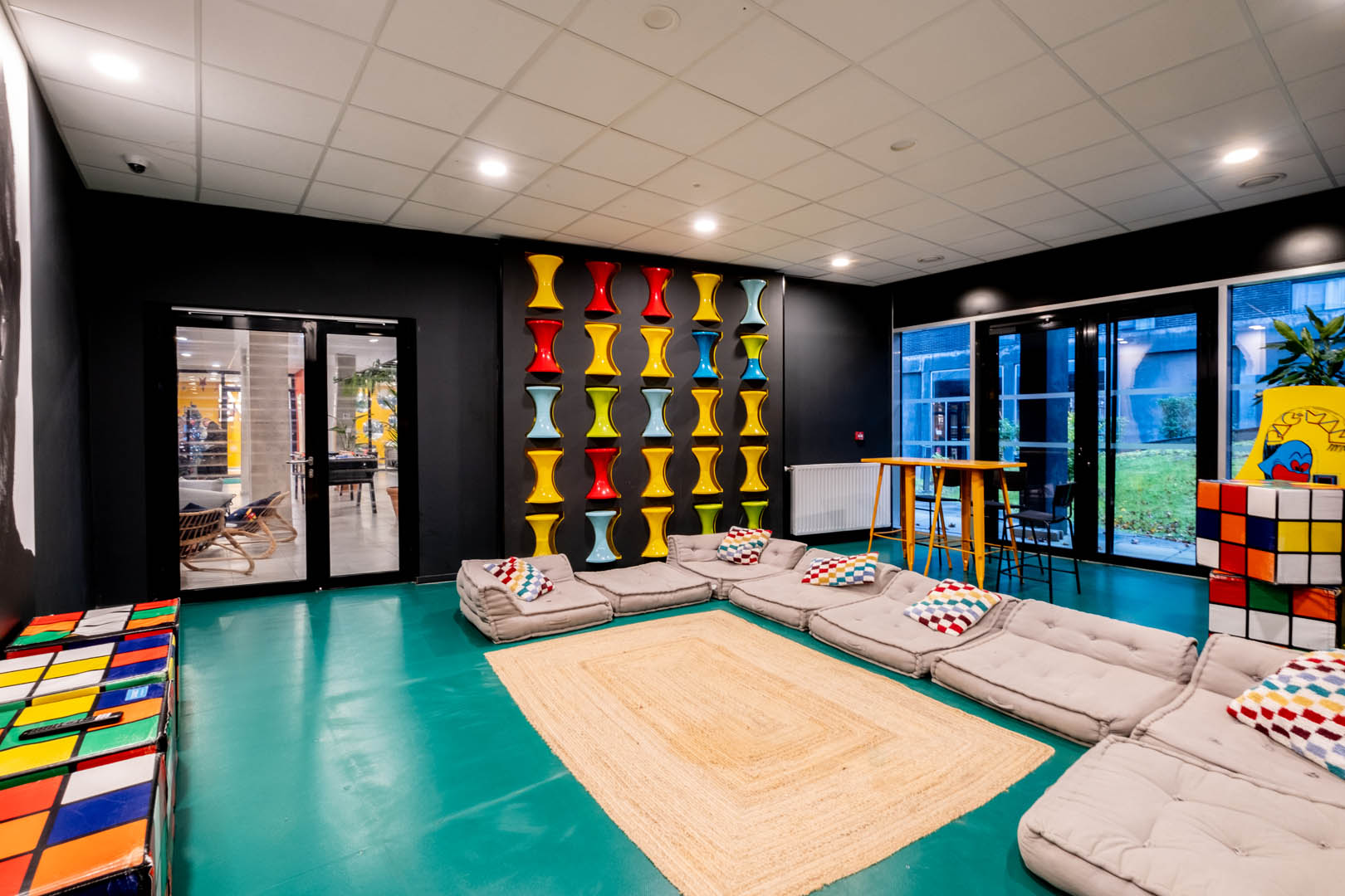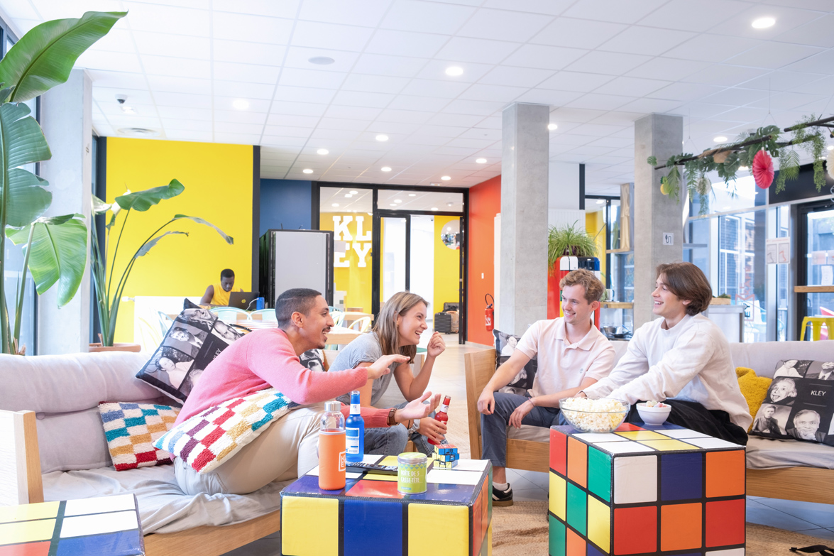 KLEY Saclay, c'est un coliving de 800m² d’espaces intérieurs et extérieurs pour tous les goûts et tous les résidents. Concrètement ? C’est un ciné, un patio avec toboggan, un baby-foot, un coin lounge, une cuisine toute équipée, et même une terrasse de 200m² pour lézarder au soleil. Et tout ça en accès gratuit !