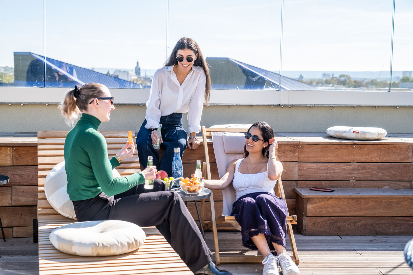 Les espaces communs de la résidence étudiante, comme le lounge, la salle de cinéma, ou encore le rooftop aménagé, sont des espaces conçus pour que vous puissiez vous détendre, travailler ou simplement discuter entre amis. Ces espaces favorisent les échanges et contribuent à l’ambiance chaleureuse qui règne tous les jours dans la résidence KLEY Reims.